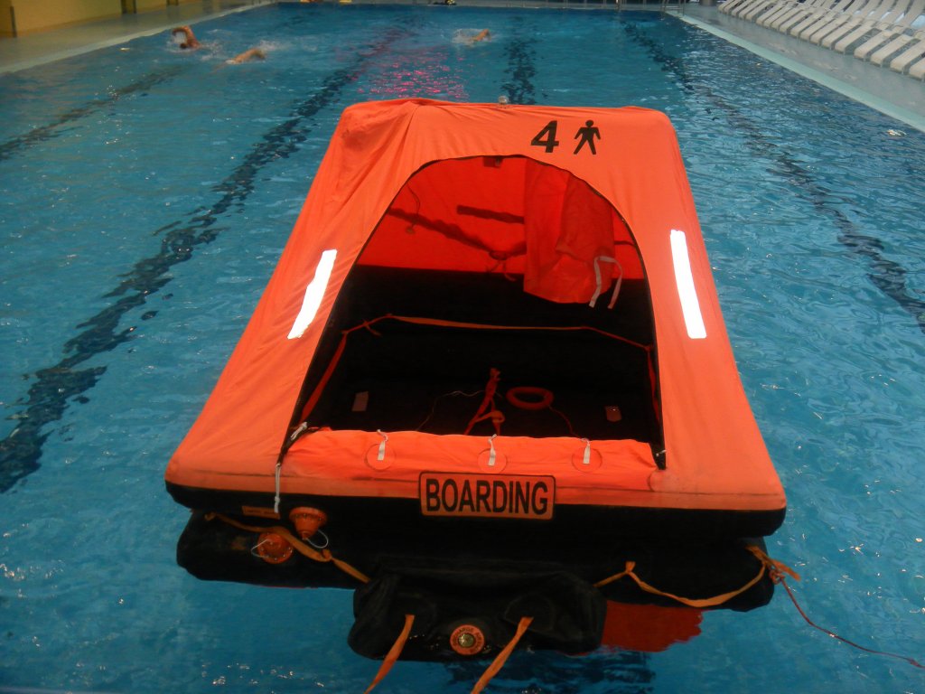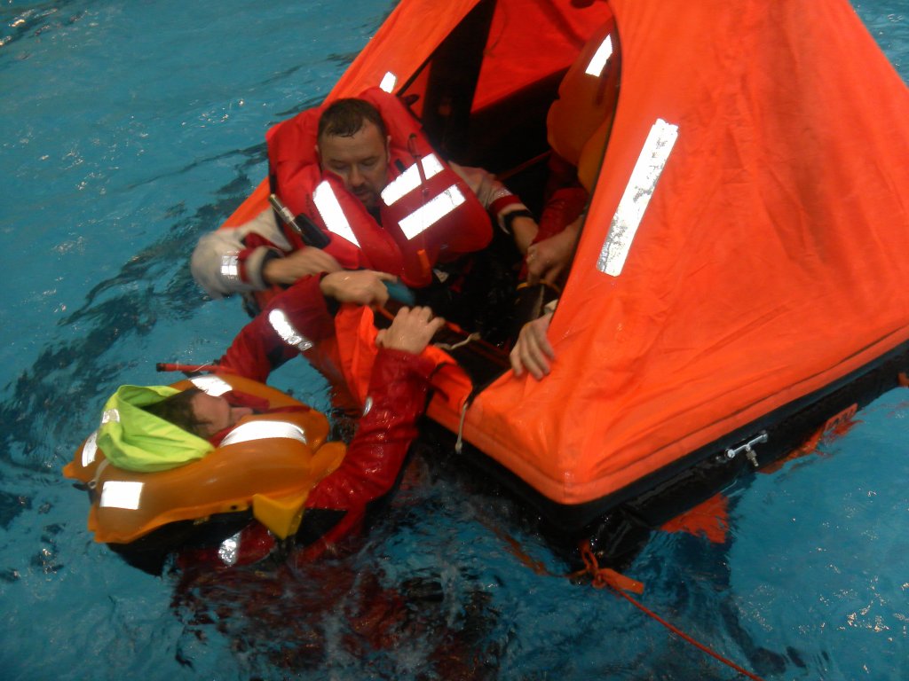 Dort wurde das richtige Verhalten im Wasser geübt. Die praktische Anwendung von Automatikwesten, einsteigen in die Rettungsinsel, die im Ernstfall lebensrettend sein kann.