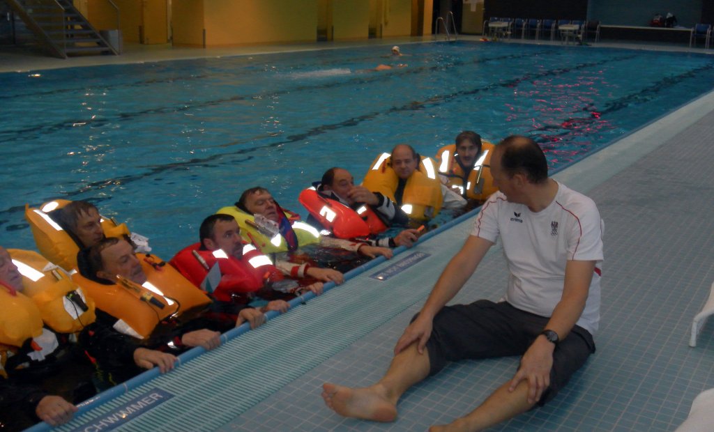 Dort wurde das richtige Verhalten im Wasser geübt. Die praktische Anwendung von Automatikwesten, einsteigen in die Rettungsinsel, die im Ernstfall lebensrettend sein kann.